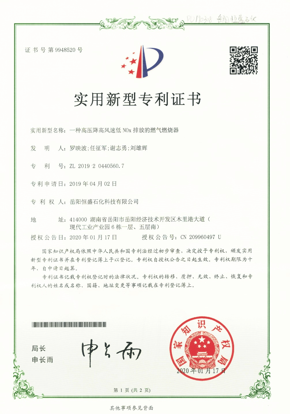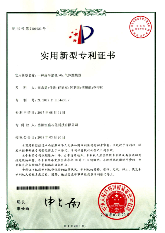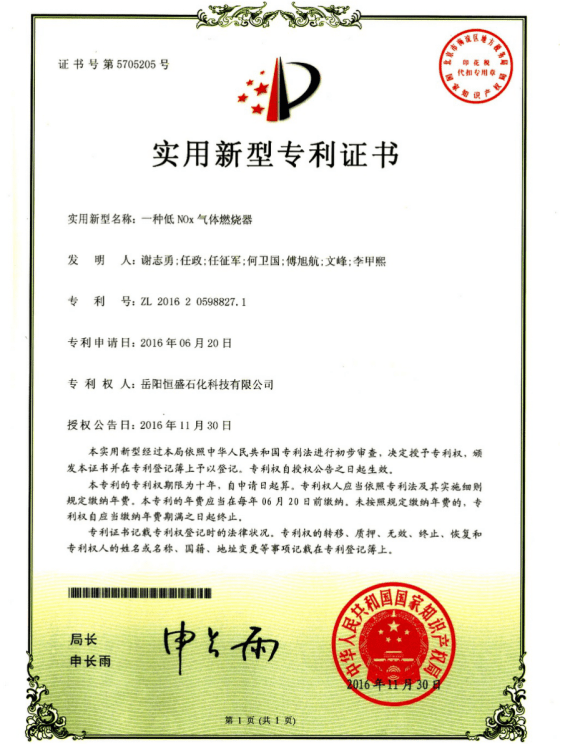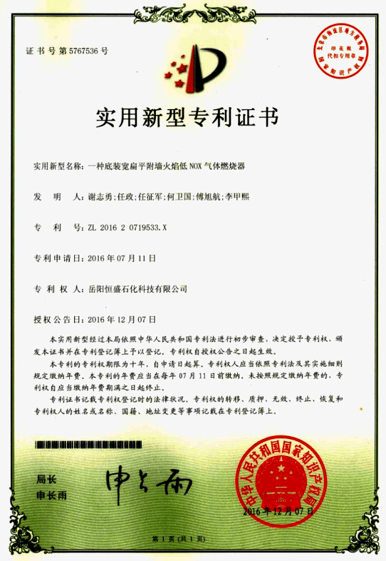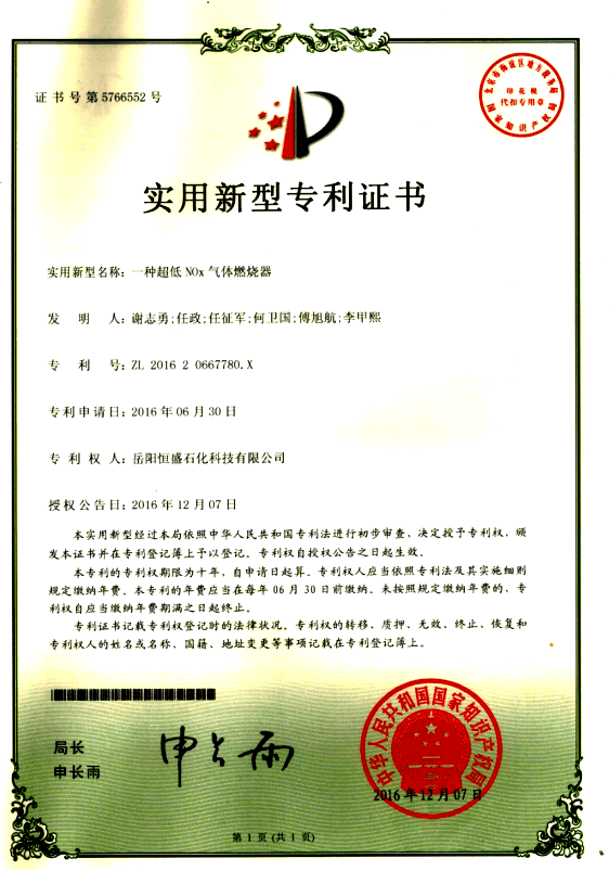 5 | ZL 2016 2 0763068X | 2016年12月28日 | 一種低NOx油氣聯(lián)合燃燒器 | 十年 | 實(shí)用新型專利 | 附證 |