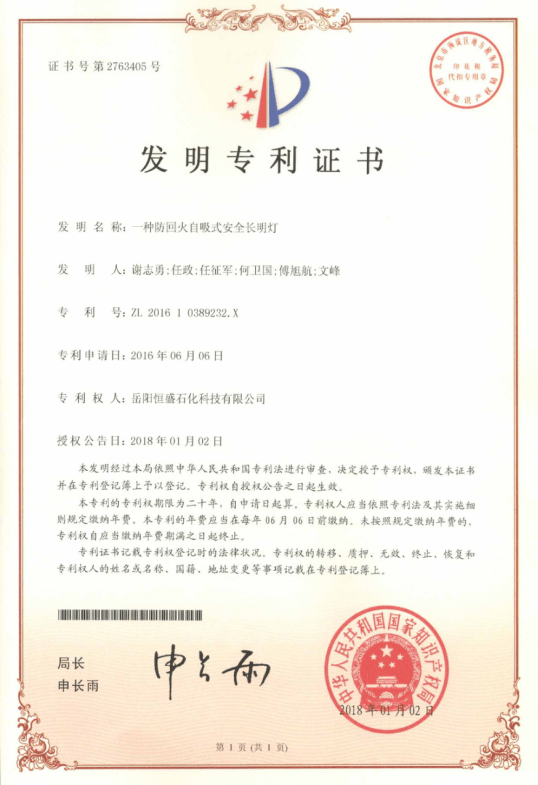 1 | ZL 2016 2 0534427.4 | 2016年11月30日 | 一種防回火自吸式安全長(zhǎng)明燈 | 十年 | 實(shí)用新型專利 | 附證 |