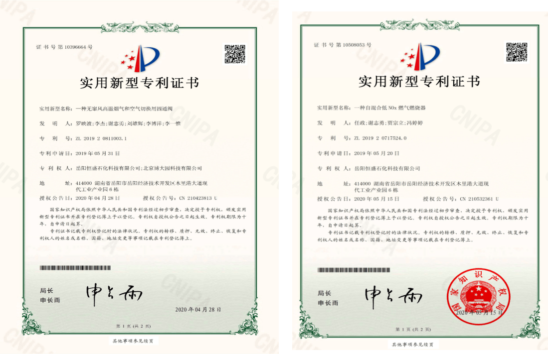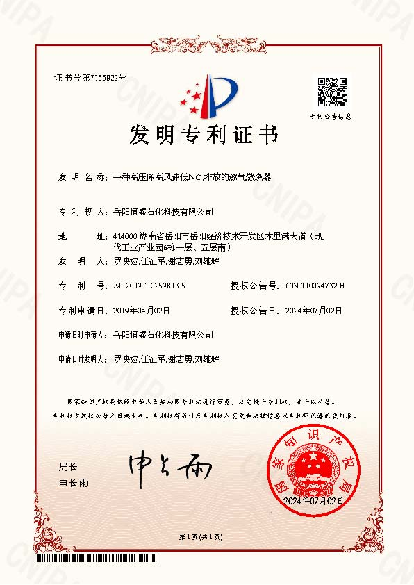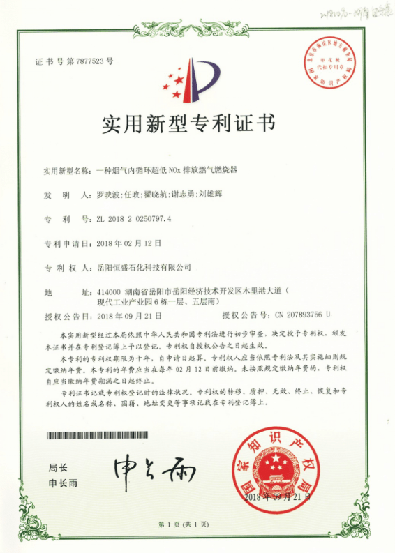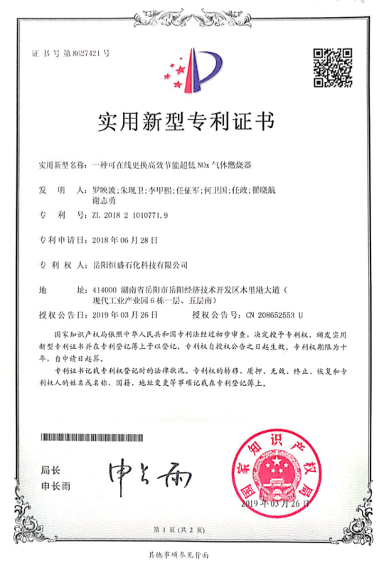 10 | ZL 2018 2 10107719 | 2019年3月26日 | 一種可在線更換高效節(jié)能 超低NOx氣體燃燒器 | 十年 | 實(shí)用新型專利 | 附證 |