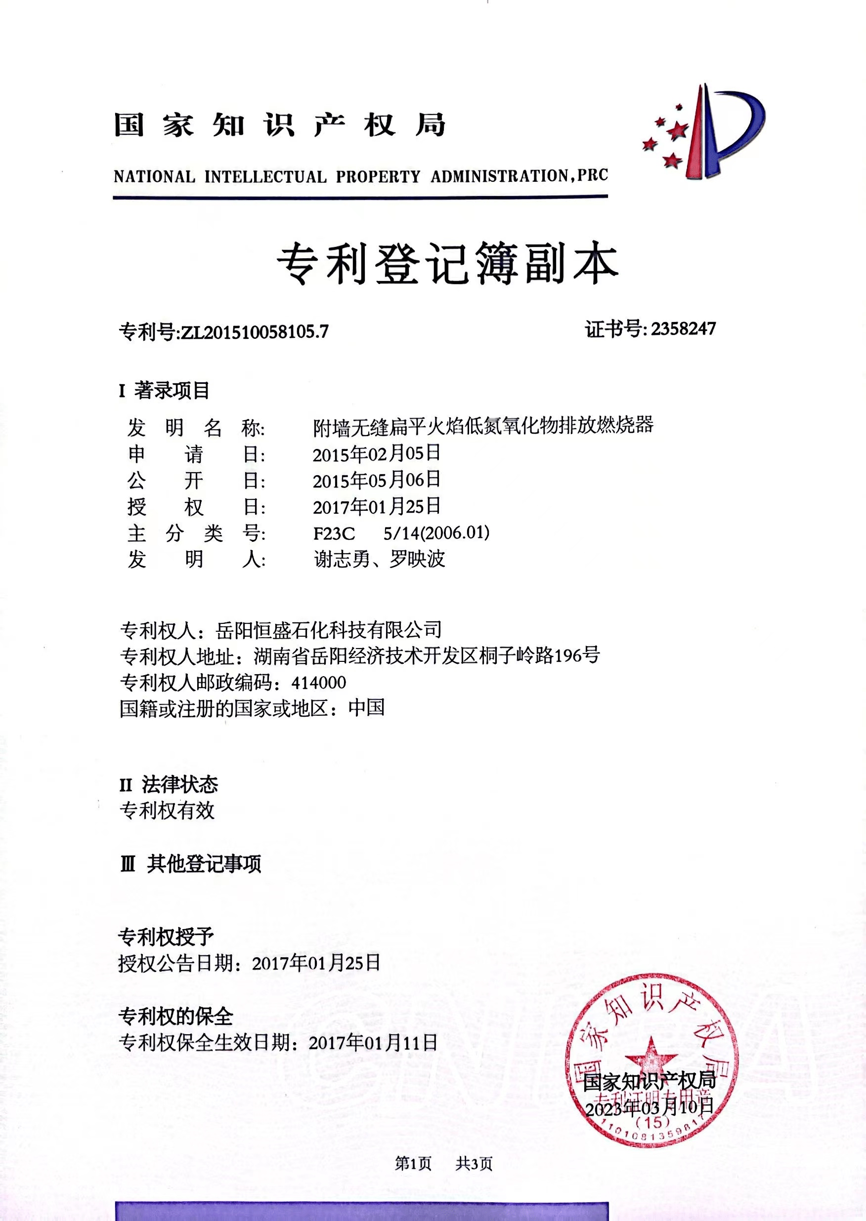 27 | 2023 219386037 | 2024年02月06日 | 一種扁平超低NOX氣體燃燒器 | 十年 | 實(shí)用新型專利 | 附證 |