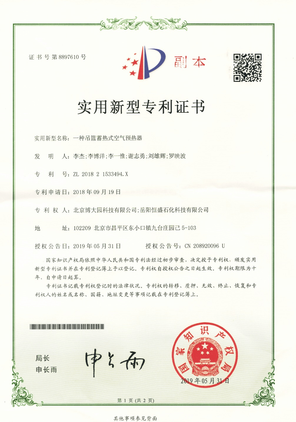 14 | ZL 201821533494X | 2019年5月31日 | 一種吊籃蓄熱空氣預(yù)熱器 | 十年 | 實(shí)用新型專利 | 附證 |