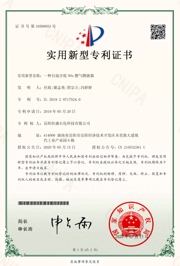 17 | ZL 2019207175240 | 2020年5月15日 | 一種自混合低氮燃燒器 | 十年 | 實(shí)用新型專利 | 附證 |