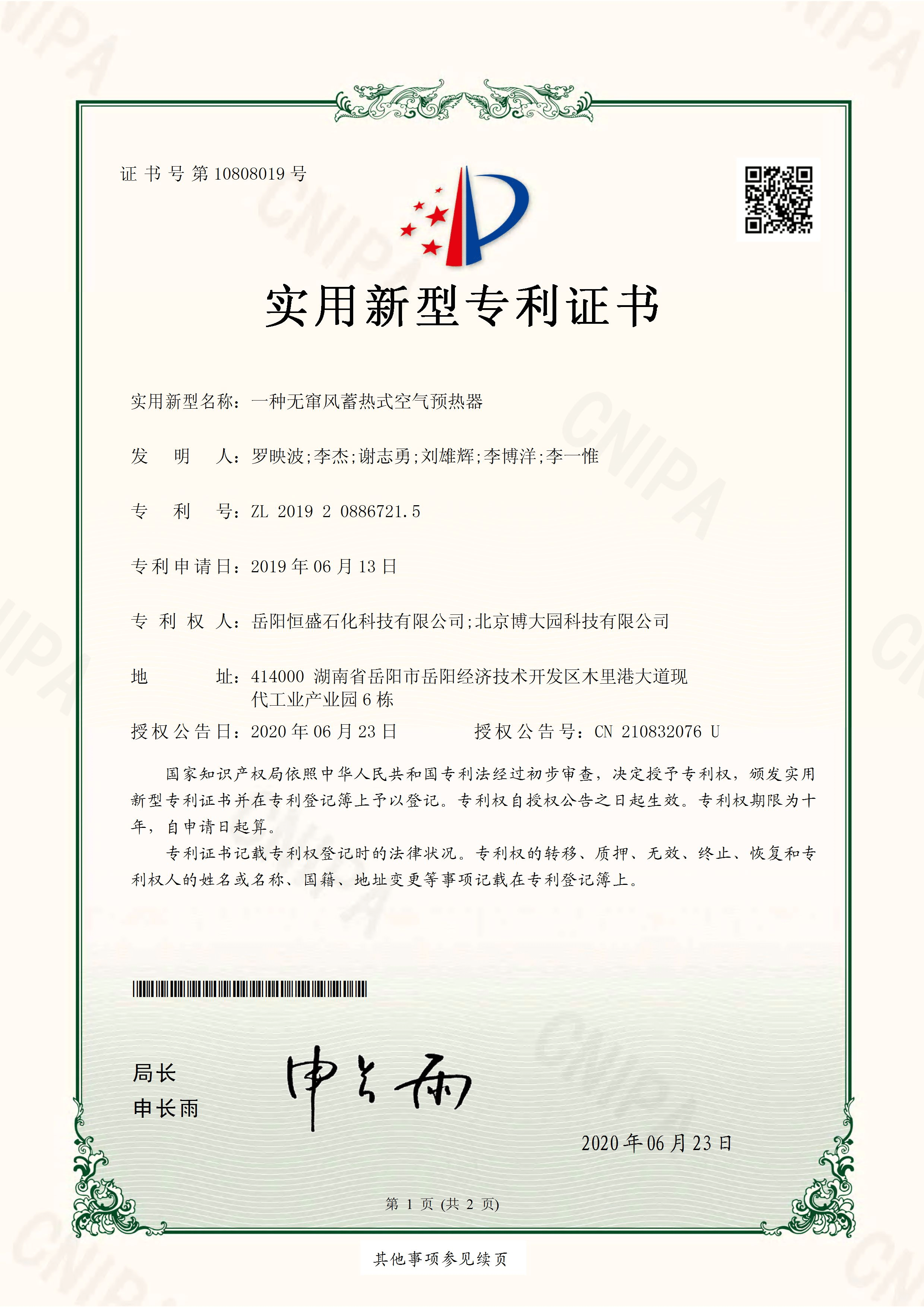 19 | ZL 2019 208867215 | 2019年7月26日 | 一種無(wú)竄風(fēng)蓄熱式空氣預(yù)熱器 | 十年 | 實(shí)用新型專利 | 附證 |