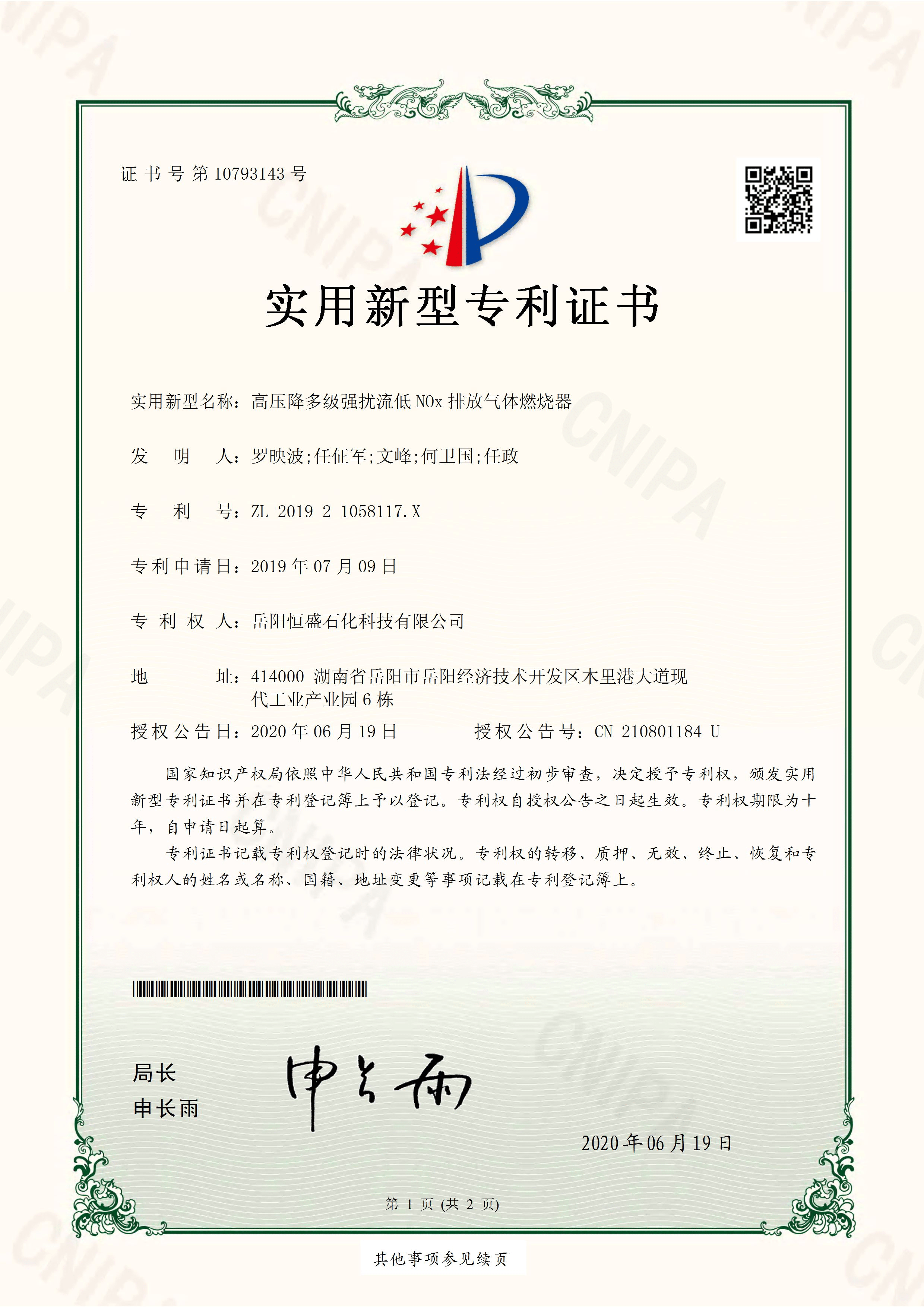 20 | ZL 201921058117X | 2019年8月26日 | 高壓降多級(jí)強(qiáng)擾流低NOx排放氣體燃燒器 | 十年 | 實(shí)用新型專利 | 附證 |