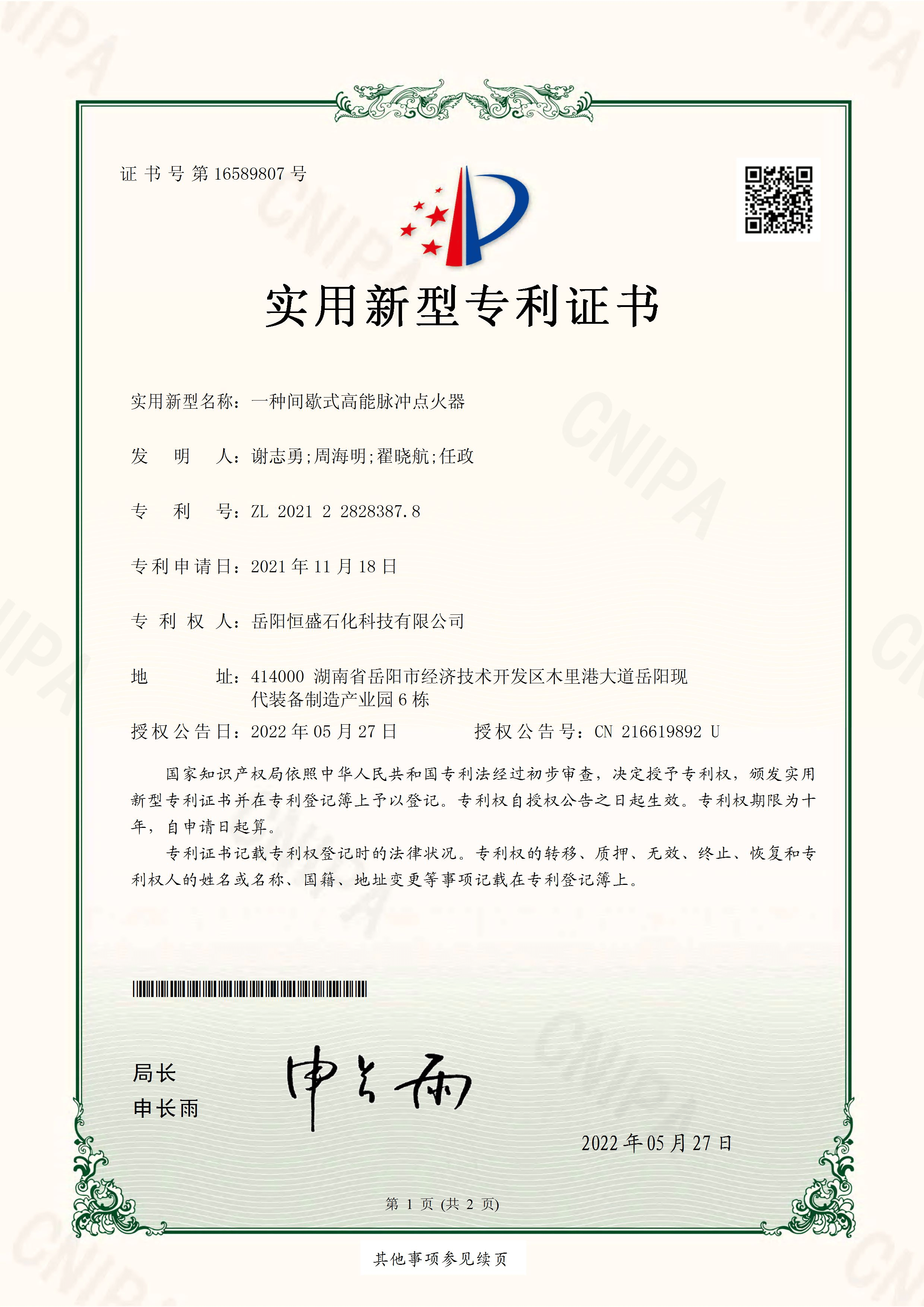 24 | ZL 2021228283878 | 2022年5月27日 | 一種間歇式高能脈沖點(diǎn)火器 | 十年 | 實(shí)用新型專利 | 附證 |