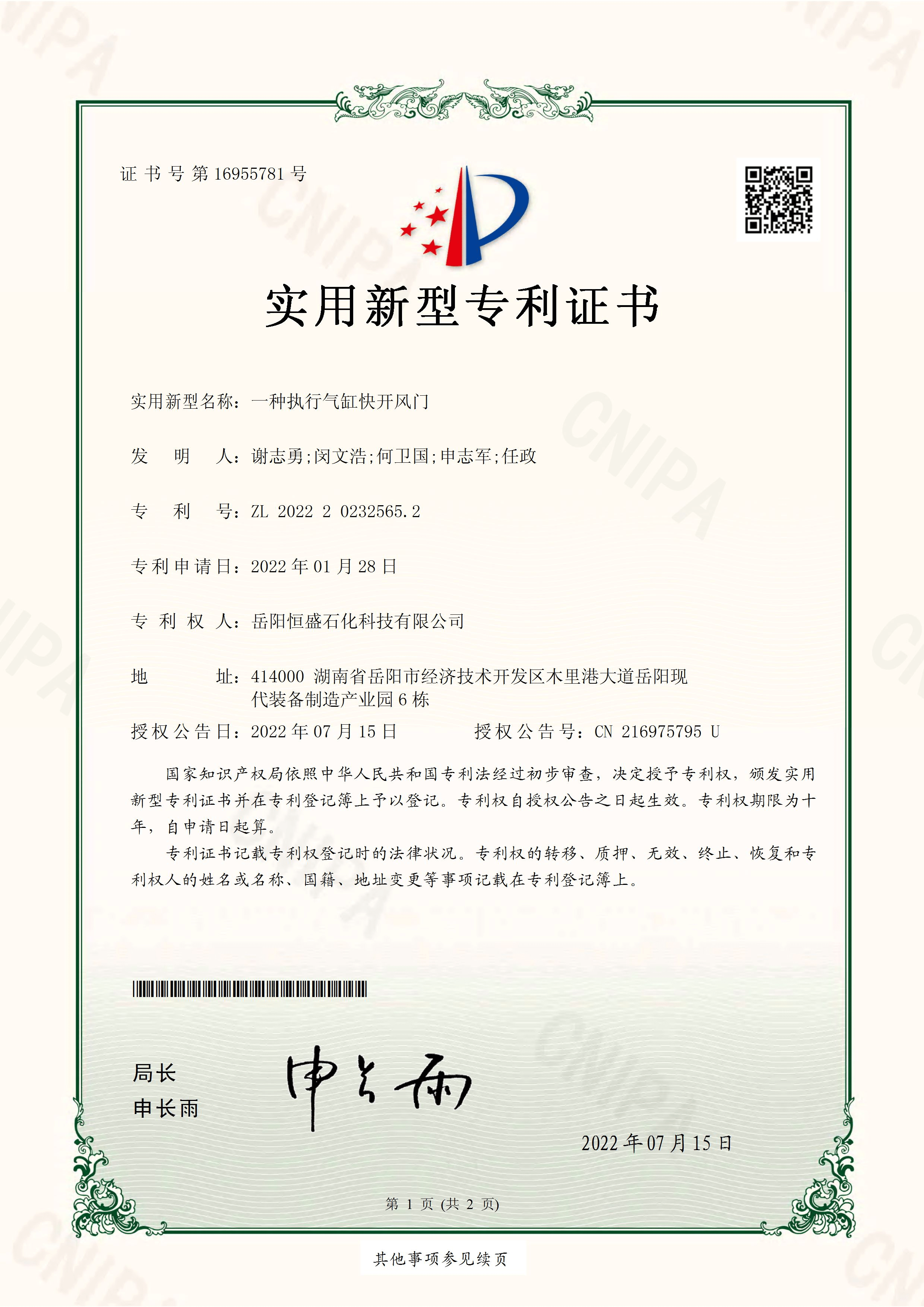25 | ZL 2022202325652 | 2022年7月15日 | 一種執(zhí)行氣缸快開(kāi)風(fēng)門 | 十年 | 實(shí)用新型專利 | 附證 |